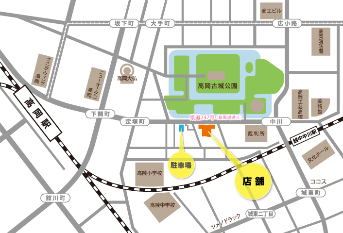 ※高岡駅から裁判所方面に進み、県道247号(桜馬場通り)沿い、古城公園のお堀前です。